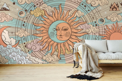 Фотообои представляют собой уникальное художественное воплощение солнца и луны в виде лиц. Они выполнены с высокой детализацией на мятном фоне, что создаёт ощущение присутствия в космическом пространстве. Лица солнца и луны имеют выразительные черты, которые придают им индивидуальность и характер.