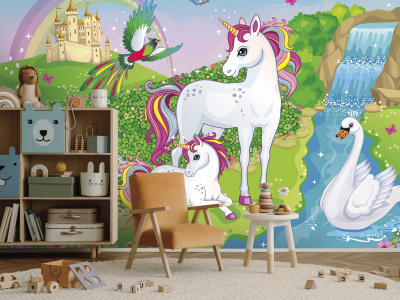 Погрузите ребёнка в мир волшебства, где два грациозных единорога мчатся сквозь сияющие струи водопада, а лебедь и диковинная птица сопровождают их в этом танце света. На фоне радуги, окутывающей загадочный замок, рождается история, полная приключений и добрых чудес. Эти фотообои — не просто декор, а портал в сказку: они пробуждают фантазию, дарят уют и вдохновляют на мечты. Изготовлены из экологичных материалов, чтобы волшебство было не только красивым, но и безопасным.