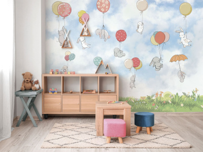 Перенесите в комнату вашего малыша уютный мир, где милые зайчата на сиреневом фоне летают на разноцветных шарах! Эти фотообои создадут атмосферу лёгкости и радости, превратив стену в живую сказку.