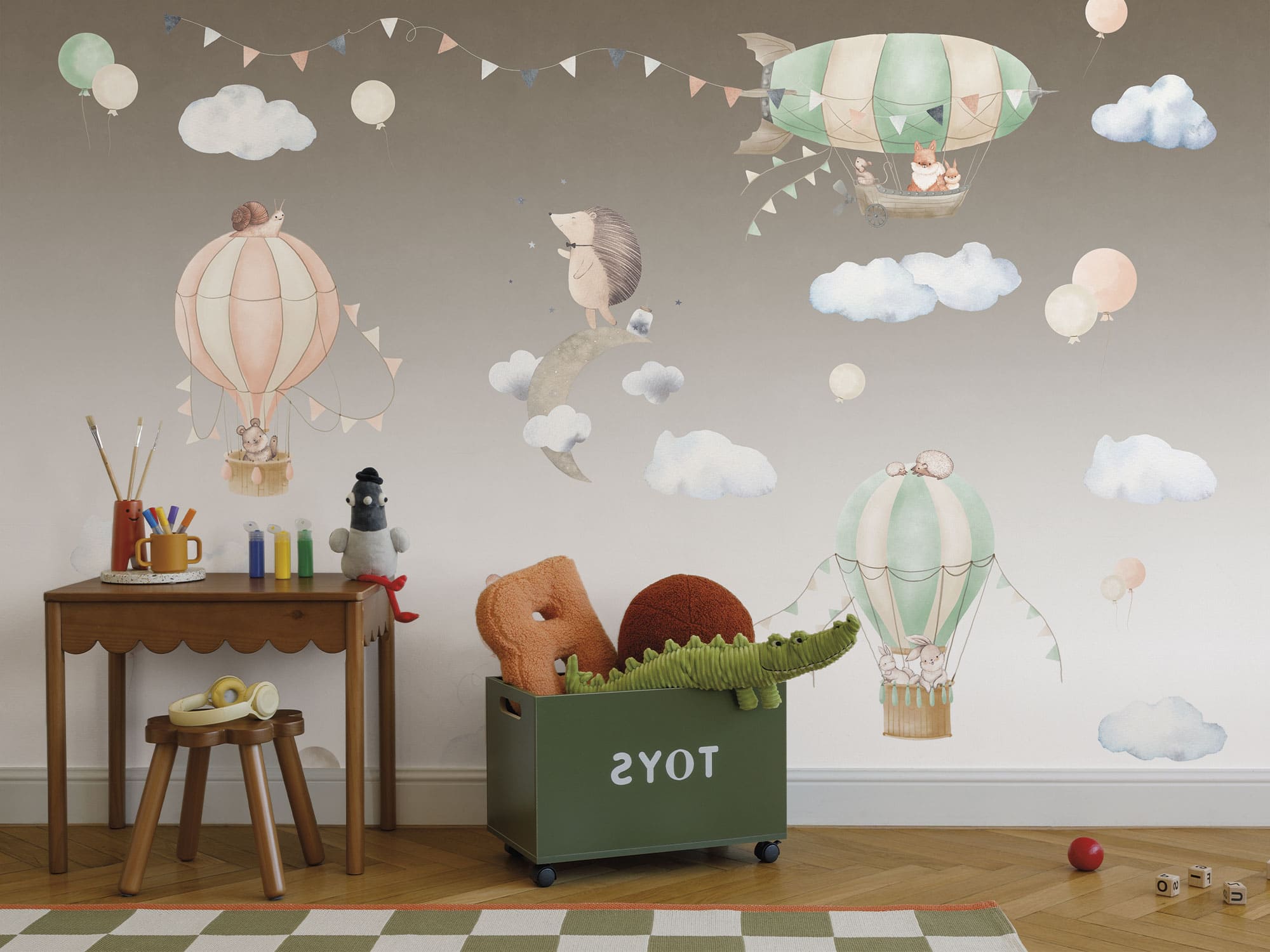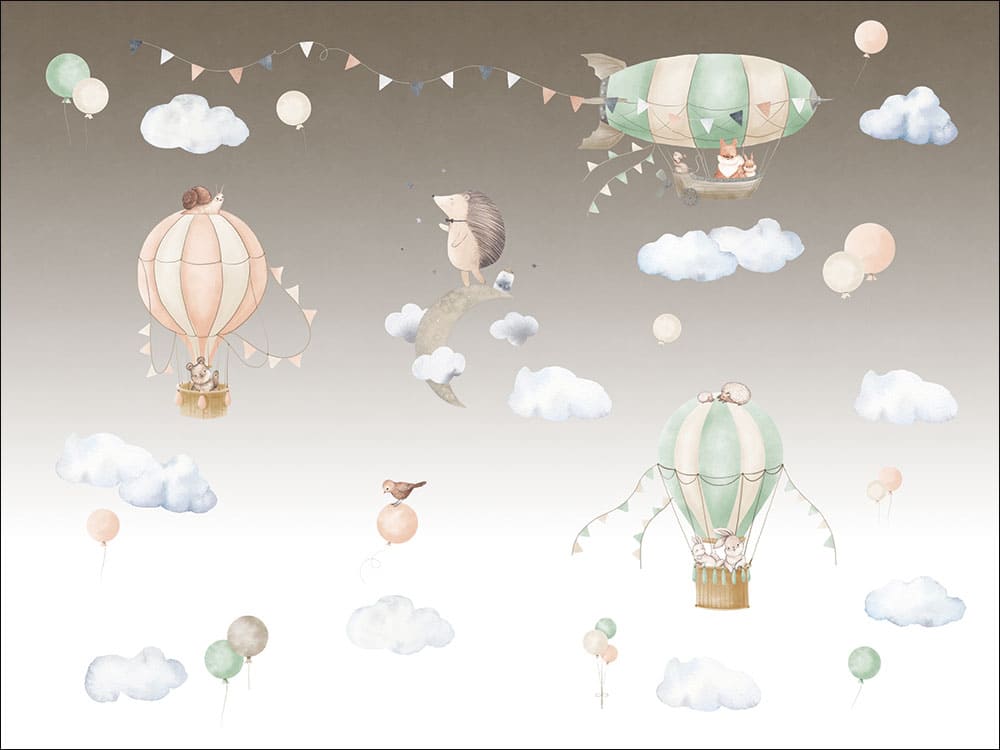 Погрузитесь в мир мечтательных приключений с этими очаровательными детскими фотообоями, где игривые иллюстрации воздушных шаров и дружелюбных зверят на светло-коричневом фоне приглашают малышей в волшебное путешествие. Каждый уголок комнаты наполнен радостью, улыбками и магией сказки.