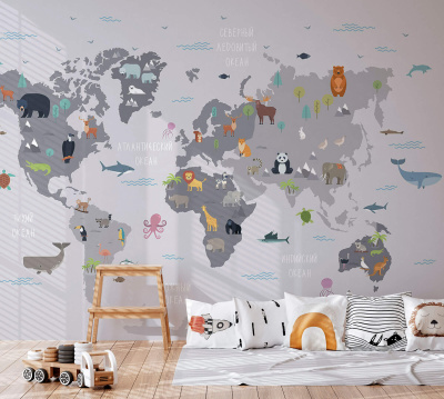 Фотообои «Детская карта с океанами и животными» представляют собой увлекательное путешествие по морским просторам и животному миру. Яркие и красочные изображения океанов, кораблей, рыб, дельфинов и других морских обитателей создают веселую и учебную атмосферу в детской комнате, вдохновляя малышей на открытия и приключения. Погрузитесь в мир морских приключений и обучения вместе с этими захватывающими фотообоями!