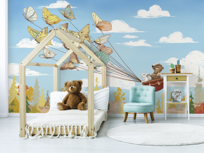 Детские нарисованные фотообои представляют собой настоящий шедевр детского творчества. На них изображены милый мишка и дружелюбный кролик, которых несут в полёт бабочки. Картина выполнена яркими и насыщенными красками, которые создают атмосферу радости и веселья.