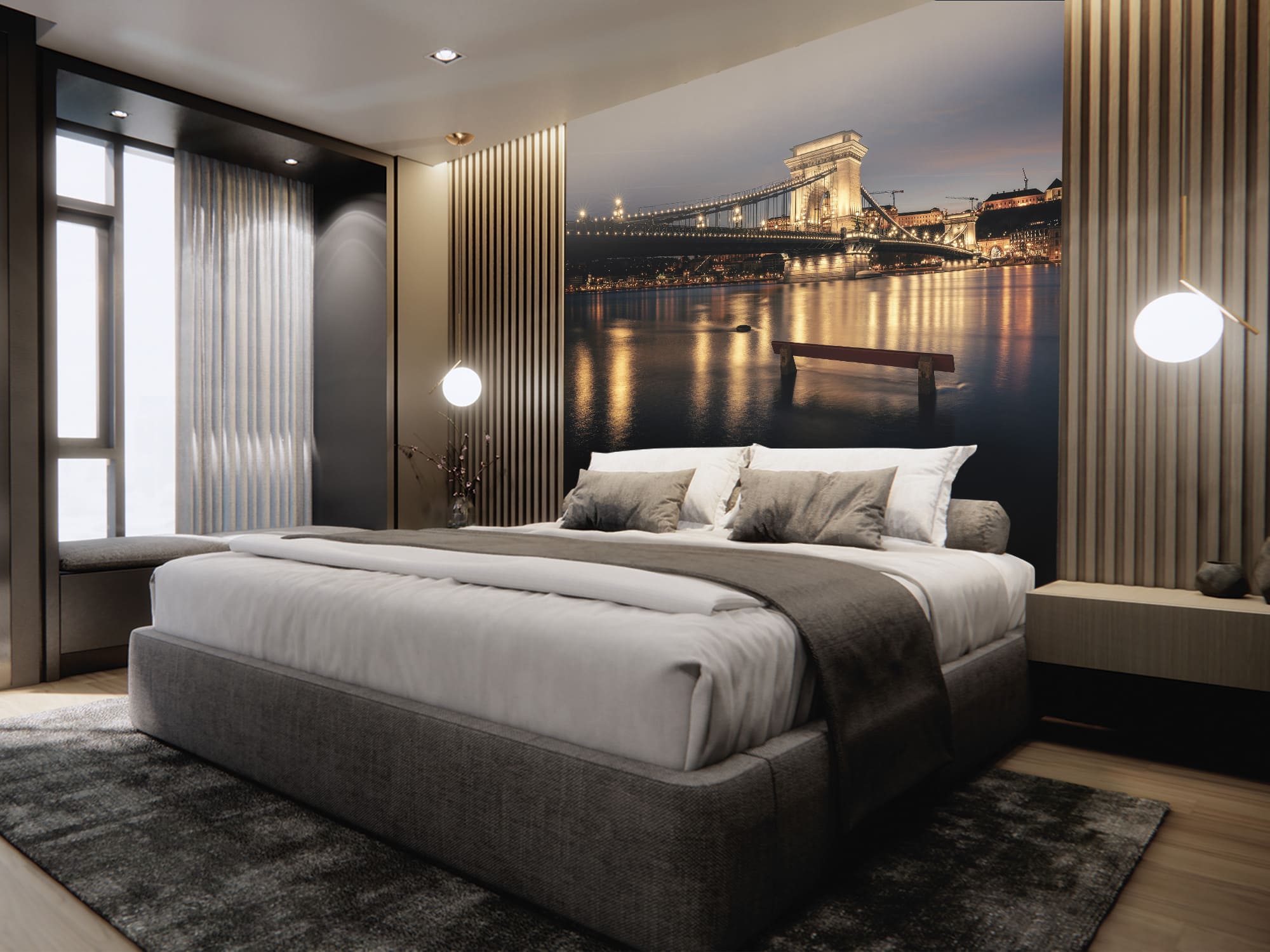 На фотообоях можно увидеть, как мост величественно возвышается над тёмной водной гладью реки Дунай. Ночное освещение придаёт мосту особый шарм и красоту, делая его ещё более привлекательным для зрителя.