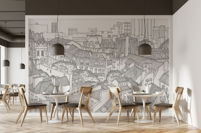 На фотообоях изображён городской пейзаж в темно-синих тонах. Детально проработанный рисунок позволяет рассмотреть разнообразные здания и создаёт ощущение присутствия в старинном городе. Эта композиция передаёт атмосферу прошлых эпох, придавая интерьеру особую изысканность и глубину.