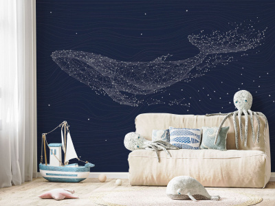 На светлом фоне изображён величественный кит на фоне линейного узора. Это произведение искусства привносит в интерьер нотку морской глубины и загадочности. Линейный стиль придаёт обоям современный и стильный вид, а кит становится центральным элементом композиции, символизирующим мощь и свободу океана. Эти фотообои станут изысканным дополнением к любому помещению, создавая атмосферу гармонии и умиротворения.