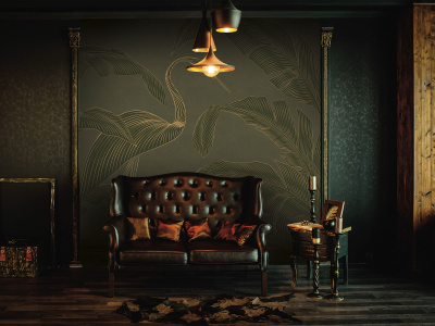 На обоях изображены грациозные фламинго, прогуливающиеся на фоне живописного пейзажа. Большие листья, украшающие композицию, придают ей особую глубину и объём. Линейный стиль оформления подчёркивает простоту и элегантность дизайна