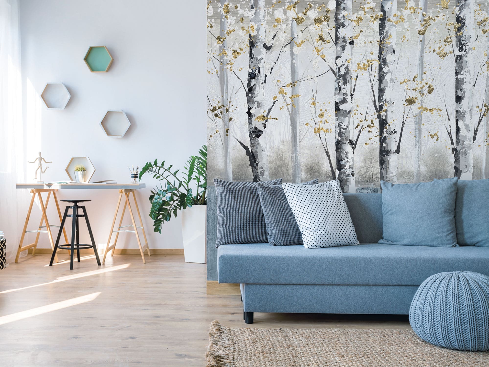 Перенесите в свой дом волшебство золотой осени! На этих фотообоях — живописная берёзовая роща, залитая мягким солнечным светом. Золотистые листья, нежные стволы деревьев и глубокая перспектива создают эффект полного погружения в природу. Идеально для создания уютной и гармоничной атмосферы в интерьере.