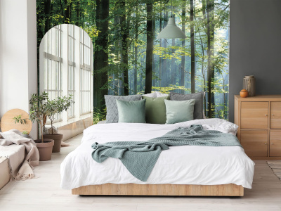 Перед вами открывается вид на густой лес, где высокие деревья, стремясь к небу, создают атмосферу покоя и гармонии. Солнечные лучи, проникая сквозь листву, создают игру света и тени. Это изображение природы позволит насладиться спокойствием и умиротворением, не выходя из дома.