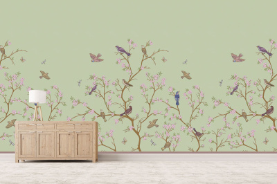 Эти фотообои в стиле шинуазри на темно-синем фоне принесут в ваш дом атмосферу восточного великолепия. Изящные птички на ветвях создадут уютную ауру загадочности и изысканности.