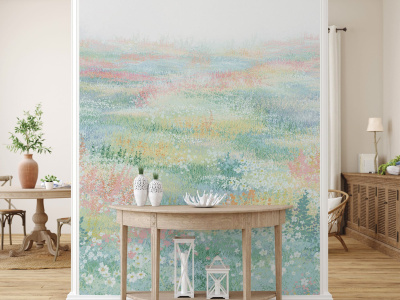 На фотообоях, изображающих поле с цветами в стиле акварели на светло-зеленом поле, каждая капля краски создает иллюзию живописного мира, где цветы кажутся настолько реальными, будто их можно потрогать. Мягкие переходы от одного оттенка к другому придают изображению нежность и легкость, словно ветер ласкает каждый цветок, заставляя их колыхаться на лугу.