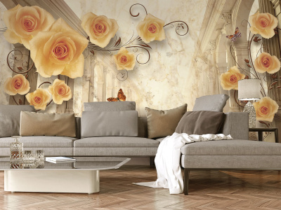 Фотообои станут изысканным украшением интерьера. На них изображены жёлтые розы, которые символизируют счастье, благополучие и гармонию. Розы выполнены с большой детализацией и реалистичностью, каждый лепесток проработан с любовью. Колонны, расположенные на заднем плане, придают композиции завершённость и монументальность. Они выполнены в классическом стиле и гармонично сочетаются с розами.