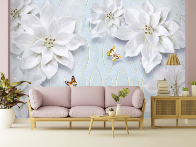 На фотообоях запечатлена удивительная сцена — порхающие бабочки кружатся среди белых цветов с крупными лепестками. Это изображение создаёт атмосферу гармонии и красоты природы. Оно может стать прекрасным украшением интерьера, добавляя в пространство нотки нежности и элегантности.