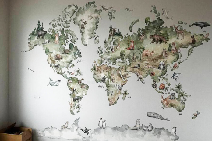 Создайте для вашего ребенка пространство, полное ярких эмоций и интересных открытий с нашими детскими фотообоями «Детская карта с материками и животными»!